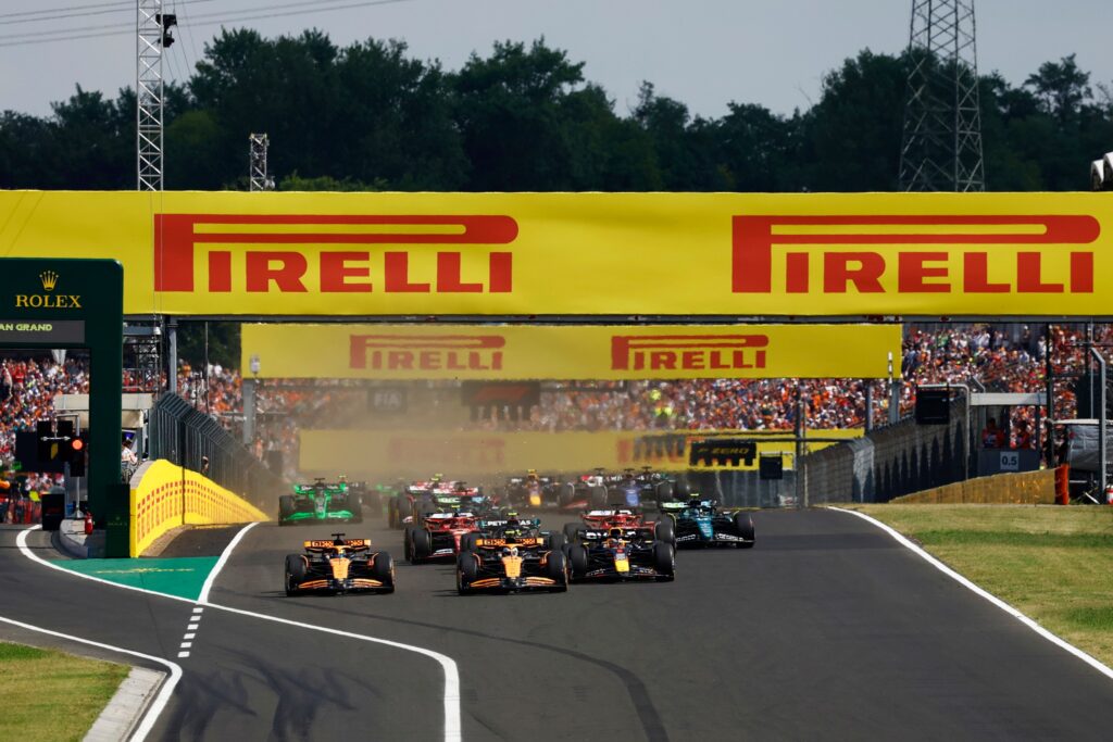HUNGARORING, HUNGARY – JULY 21: Lando Norris, McLaren MCL38, leads Max Verstappen, Red Bull Racing RB20, Oscar Piastri, McLaren MCL38, Fernando Alonso, Aston Martin AMR24, Charles Leclerc, Ferrari SF-24, Carlos Sainz, Ferrari SF-24, and the rest of the field at the start during the Hungarian GP at Hungaroring on Sunday July 21, 2024 in Budapest, Hungary. (Photo by Zak Mauger / LAT Images)