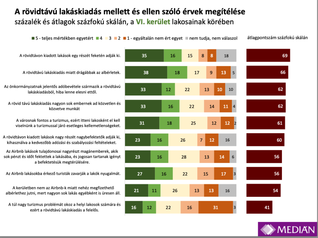 Először készült Magyarországon átfogó, reprezentatív felmérés a rövid távú lakáskiadás megítéléséről, hatásairól és az esetleges szabályozások szükségességéről. A Medián által készített közvélemény kutatás kifejezetten azon belső kerületek (V., VI., VII., VIII. és IX.) lakosságát kérdezte, ahol airbnb lakások számottevő mértékben vannak jelen. Ezen belül a VI. kerület – ahol nemrég szavazás zajlott az airbnb betiltásáról –, önállóan is elemezhető almintával külön fókuszt kapott.