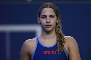 Pádár Nikolett a női 200 méteres gyorsúszás előfutama után a dohai vizes világbajnokságon 2024. február 13-án. MTI/Kovács Tamás